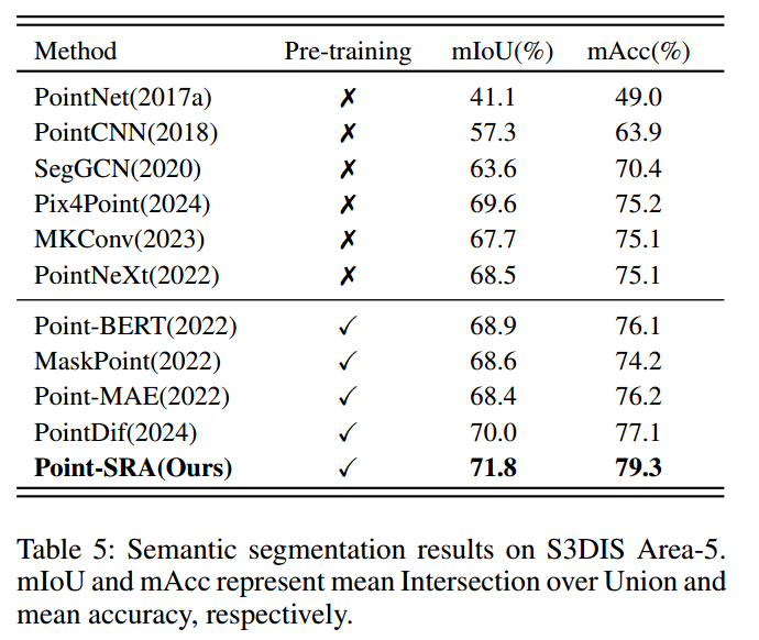 如表5所示,Point-SRA在S3DIS测试集上的mIoU达71.8%、mAcc达79.3%。