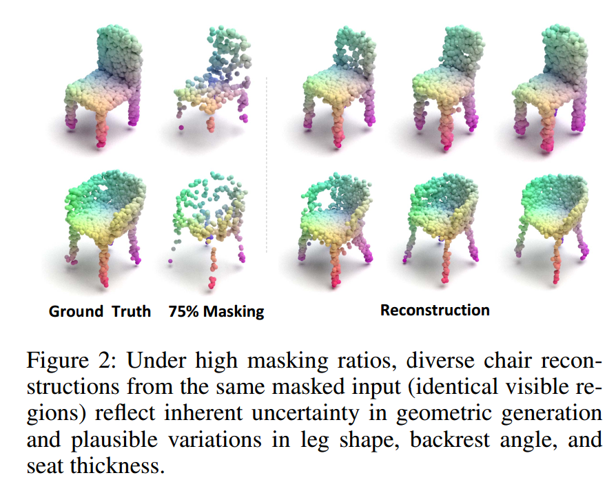 - 在高掩码率下,3D MAE中的逐点确定性重建常出现失配问题------它无法适配点云固有的结构多样性。如图2所示,同一可见区域可能对应多种合理的重建结果。