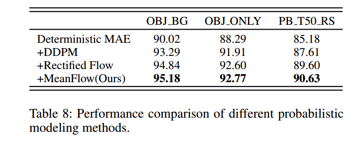 表6展示了不同组件组合下的性能表现:MeanFlow带来了显著提升,使PB_T50_RS子集的准确率提高了5.45%,验证了概率重构相比逐点重构的有效性。