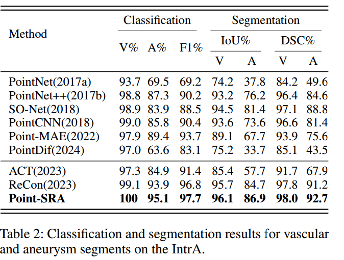 如表2所示,Point-SRA的F1分数达97.7,优于Point-MAE(提升4)与多模态ACT方法(Dong等人,2023,提升6.3);在分割任务中,Point-SRA在动脉瘤区域的IoU达86.9%、DSC达92.7%,显著超过主流分割基线模型。
