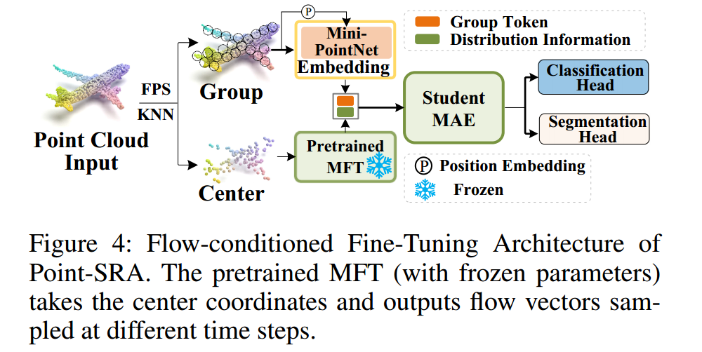 其中 Center ∈ R G × 3 \text{Center} \in \mathbb{R}^{G \times 3} Center∈RG×3表示每个点云组的中心坐标, MFT frozen \text{MFT}_{\text{frozen}} MFTfrozen代表参数冻结的预训练MFT模块。时间参数 t t t和 r r r的采样方式与预训练阶段一致。