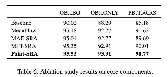 逐步移除Point-SRA的关键组件,以量化每个模块对最终性能的贡献。以Point-MAE为基线,所有组件均采用流条件微调架构。