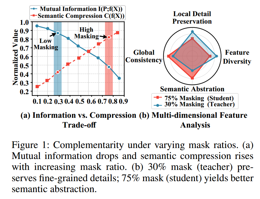 尽管效果显著,但现有方法大多基于经验设置采用固定掩码率 ,缺乏对"掩码率如何影响学习到的表征"的理论洞察。这引出了一个关键但尚未充分探索的问题:不同掩码率是否会天然产生丰富度各异的表征?这些差异能否被利用以提升整体表征质量?
