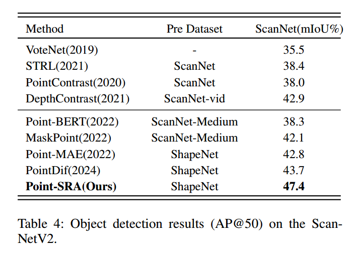 ScanNetV2包含1513个完整扫描的室内场景,覆盖18个常见物体类别。我们遵循标准平均精度(AP)指标,在IoU阈值0.5(AP@50)下进行评估。如表4所示,Point-SRA预训练编码器的AP@50达47.4%,