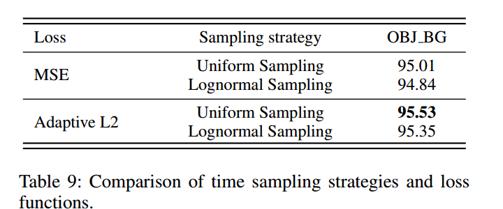 表9对比了不同时间调度方法:在区间 [ 0 , 1 ] [0,1] [0,1]上的均匀采样为MeanFlow提供了最稳定的训练信号,性能优于对数正态采样。