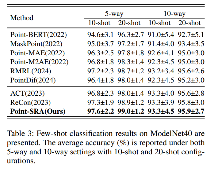 如表3所示:在5分类配置中,Point-SRA在10-shot、20-shot设置下的平均准确率分别达97.6%、99.0%,相比Point-MAE基线(Pang等人,2022)分别提升1.3%、1.2%;在10分类配置中,Point-SRA在10-shot、20-shot设置下的准确率分别达93.3%、95.9%。