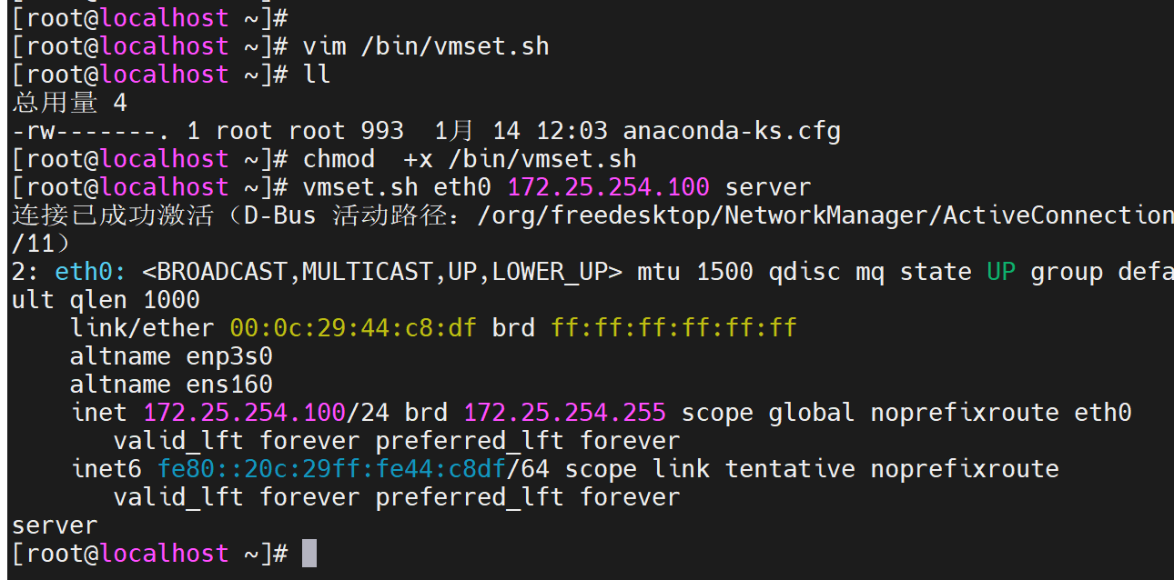root@node10 \~\]# chmod +x /bin/vmset.sh \[root@node10 \~\]# vmset.sh eth0 172.25.254.100 server