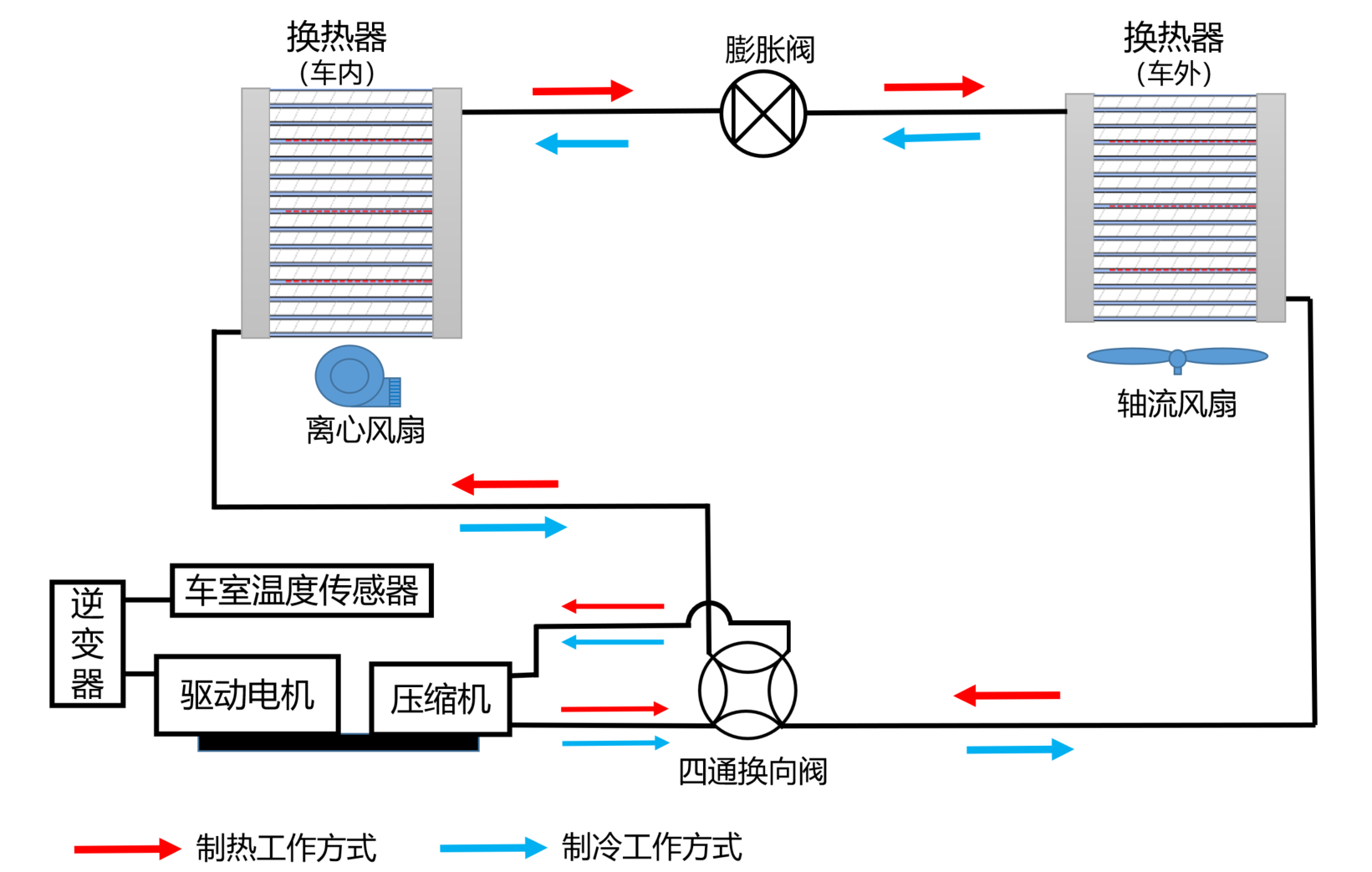 当乘员舱有制冷需求时,空调则按照传统空调回路进行工作------空调冷媒先后流经空调压缩机、冷凝器、膨胀阀和蒸发器进行制冷;当乘员舱有制热需求时------空调冷媒回路先后流经空调压缩机进行压缩、车内换热器放热,然后经由电子膨胀阀进入车外换热器进行蒸发吸热,从而形成完整的热泵循环。