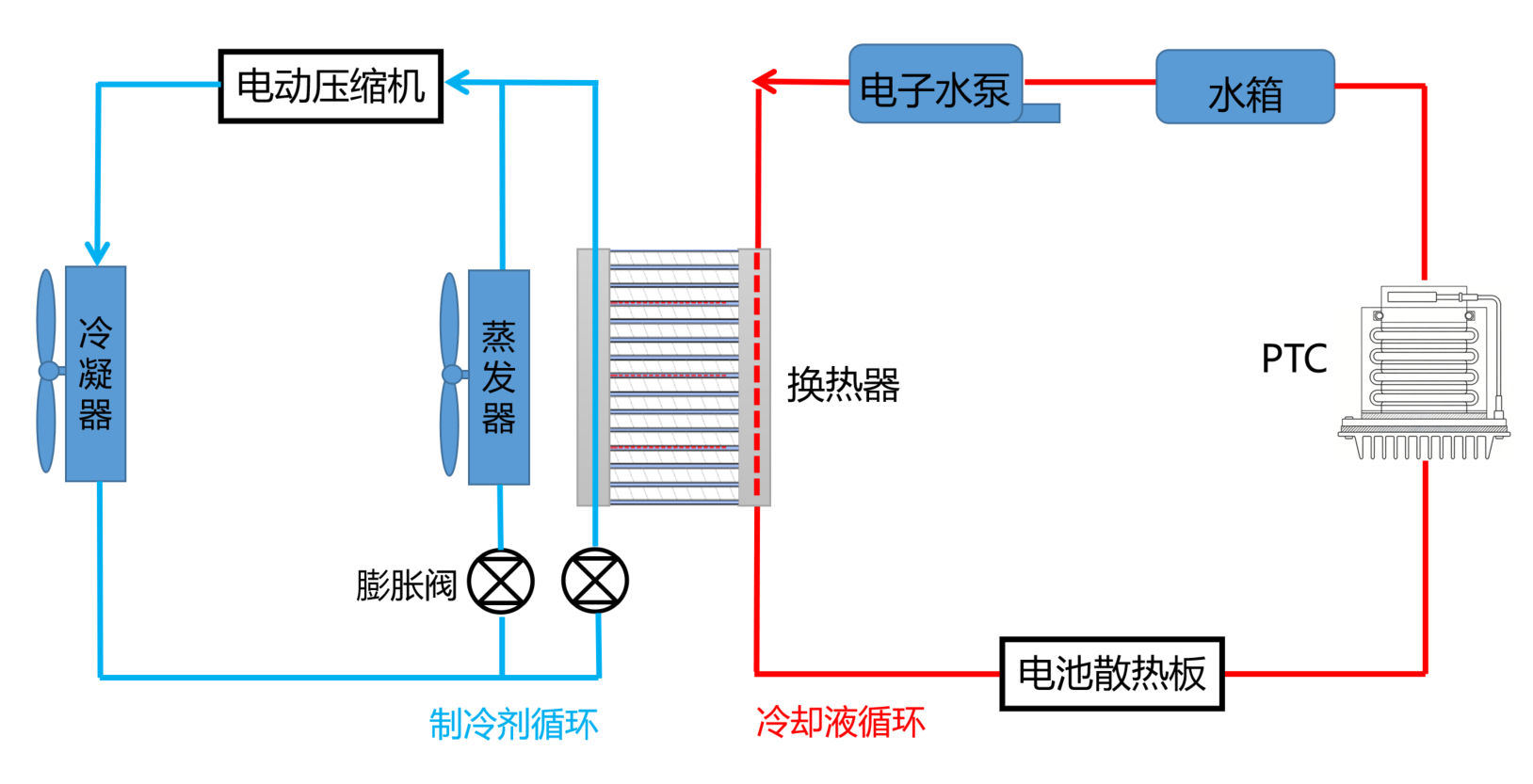 水冷模式,即电池采用水冷方式换热。一般会增加一个换热器来与制冷循环相耦合起来,并通过制冷剂将电池的热量带走。整个系统主要包括:电子水泵、换热器、电池散热板、PTC加热器和膨胀水箱。其结构如下图所示。