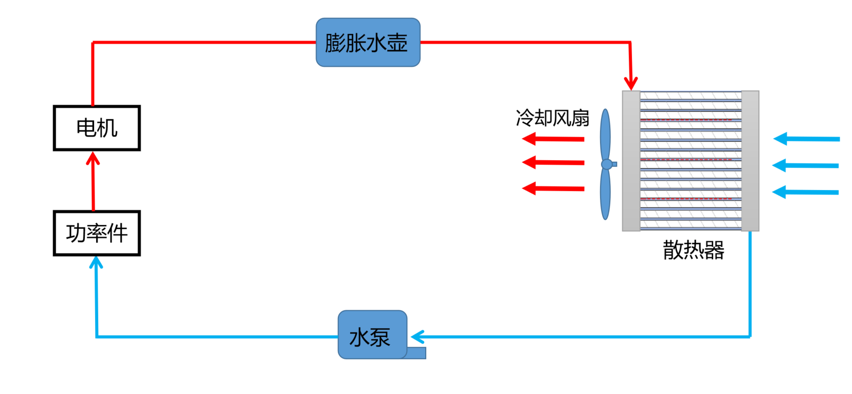 电机冷却系统跟发动机冷却系统相似,一般由电动水泵、散热器、冷却风扇、膨胀水壶和管路等部件组成。如果车内的电子功率件(电机控制器、DCDC等)的冷却方式与电机的相同,则通常会把功率件也串联在此回路里面,并根据各个零部件的温度特性进行排布。