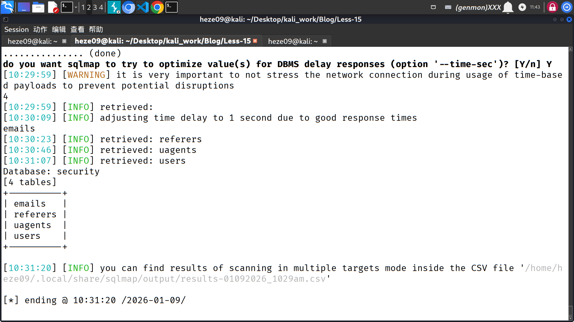 查询结果如图所示:数据表共有4个,分别是emails, referers, uagents, users。