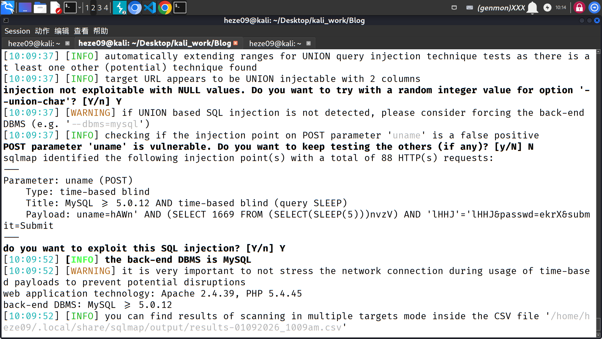 查询结果如图所示:存在注入点uname,注入方式为POST,注入类型为:time-based blind; 并给出了相应的payload。