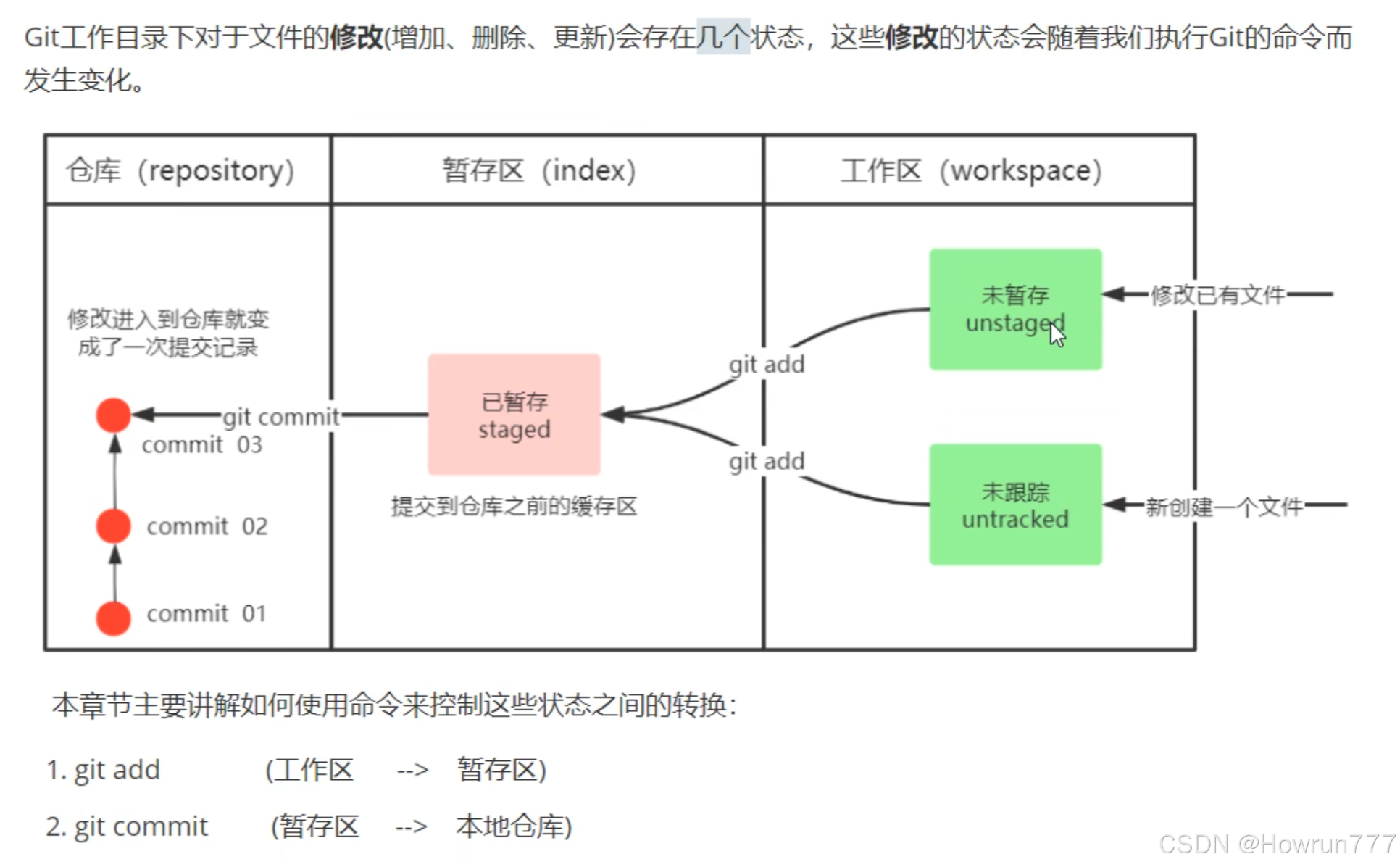 工作区 = 红色 (git status 显示的颜色) = 还没 add。