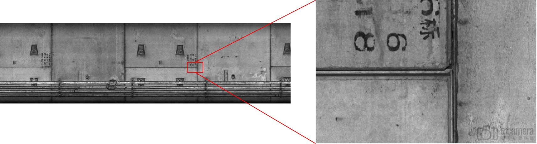 下列图像为地铁隧道成像效果节选,其中测试模块为单激光模块,测试距离2米,测试速度50公里,光圈F5.6,曝光时间25us。