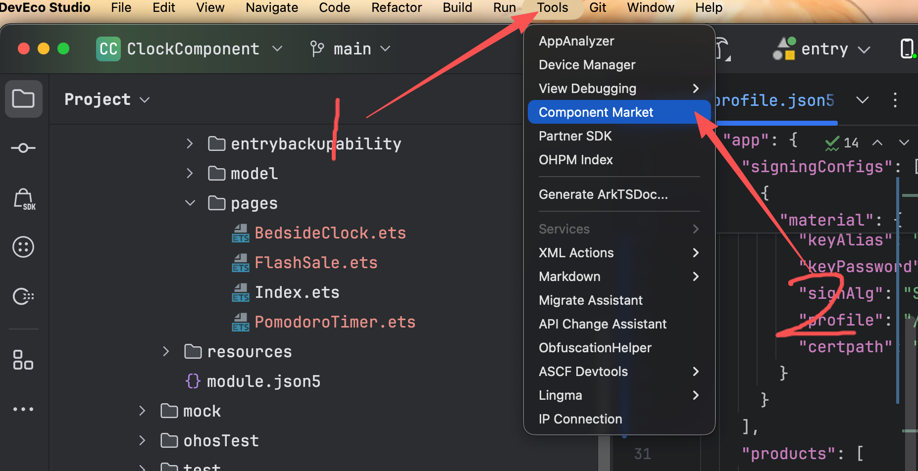 在DevEco Studio中点击Tools->Component Market:
