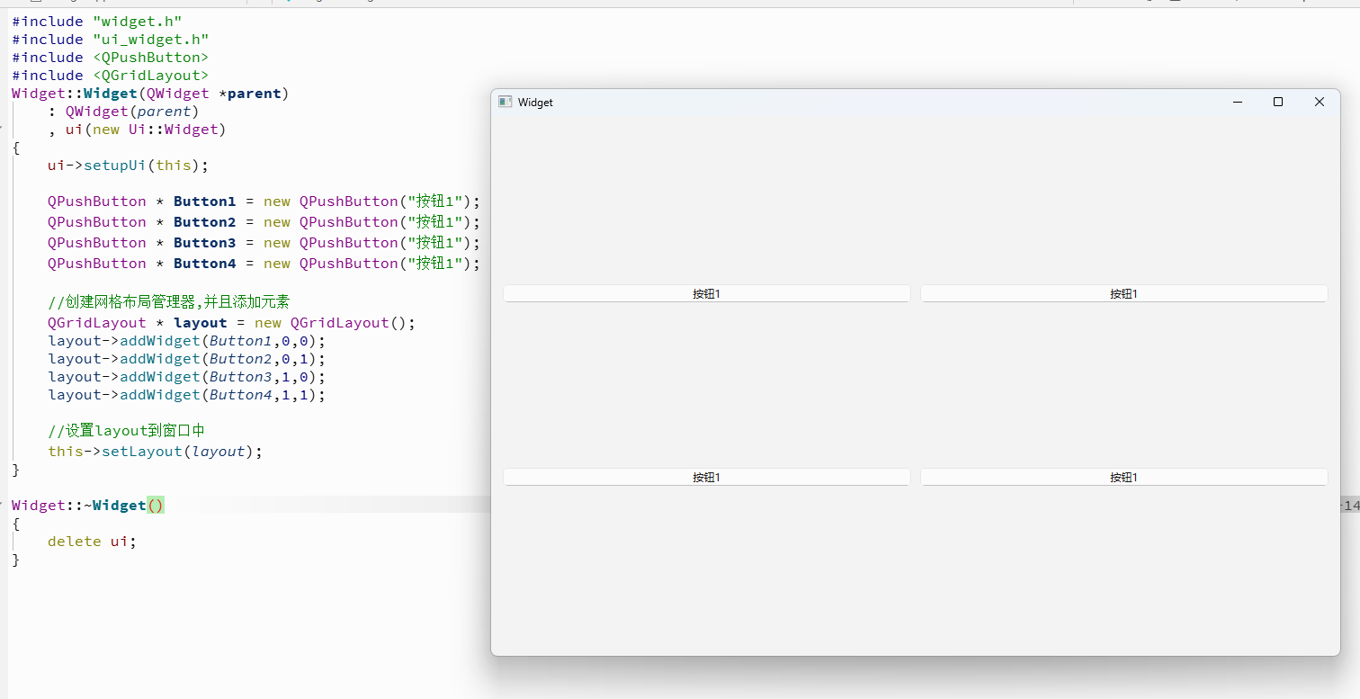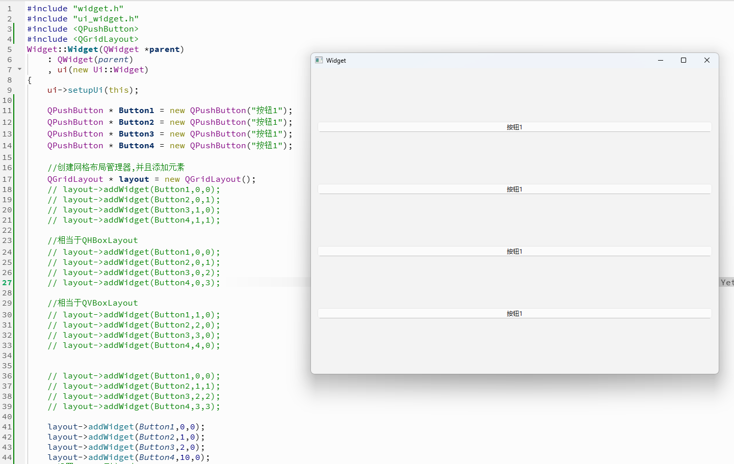 总的来说, 使用QGridLayout 能够代替很多 QHBoxLayout 和 QVBoxLayout 嵌套的场景. 毕 竟嵌套的代码写起来是比较麻烦的.