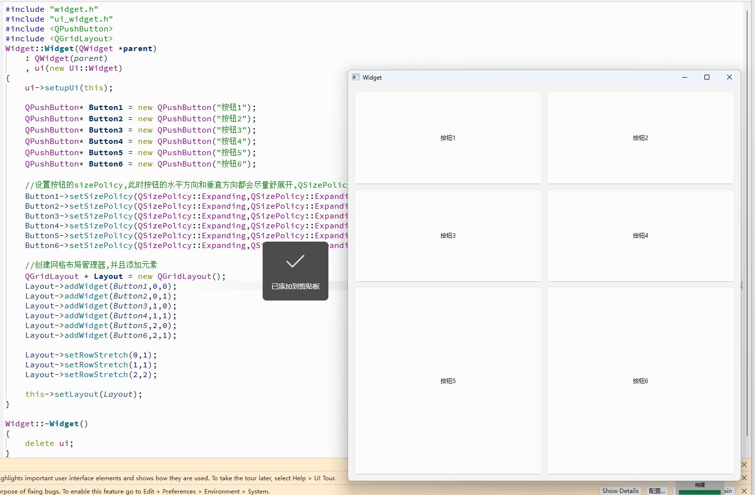 另外, QGridLayout 也提供了 setRowStretch 设置⾏之间的拉伸系数. 上述案例中, 直接设置 setRowStretch 效果不明显, 因为每个按钮的高度是固定的. 需要把按钮的垂直方向sizePolicy 属性设置为 QSizePolicy::Expanding尽可能填充满布局管理器, 才能看到效果.