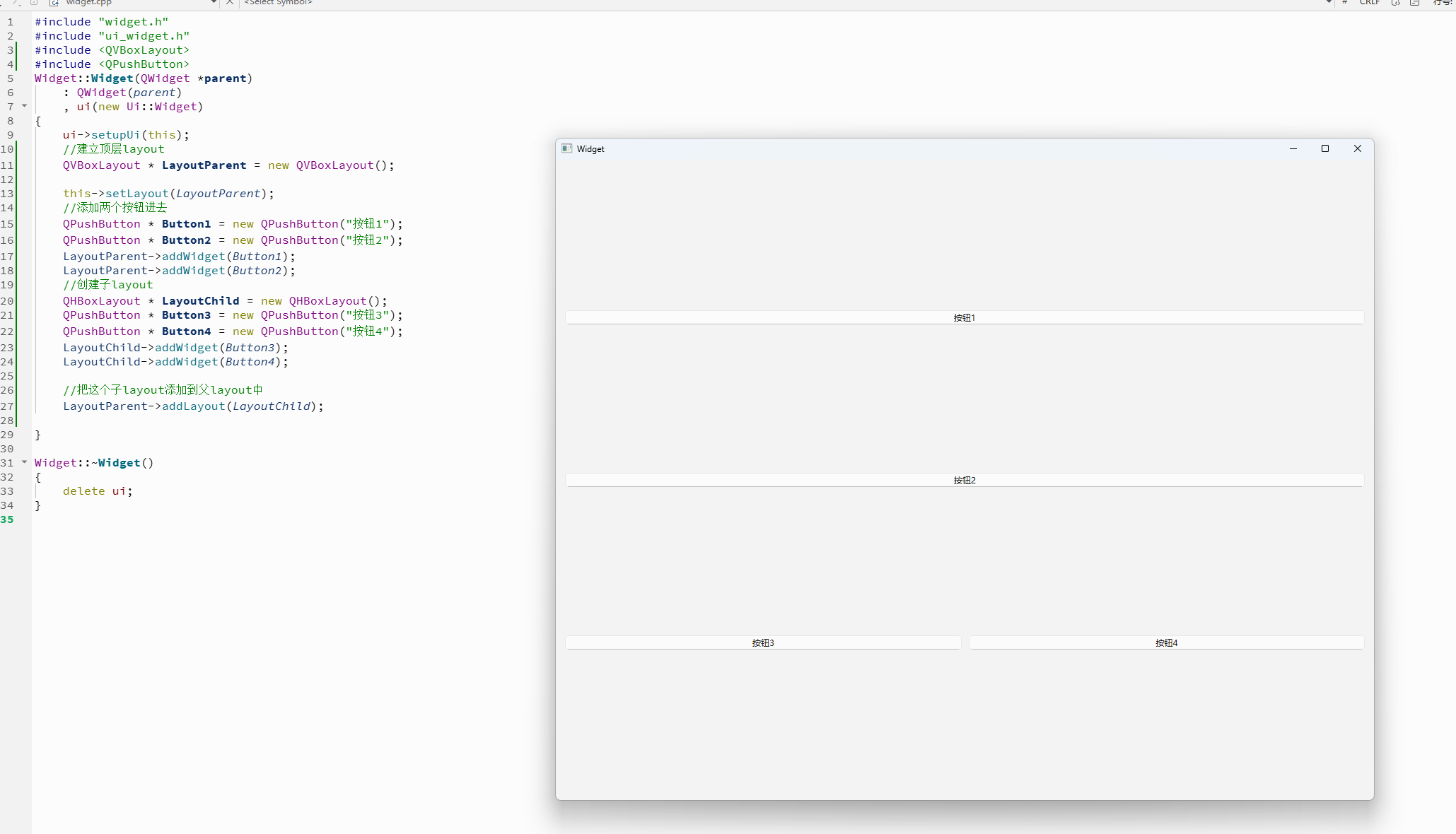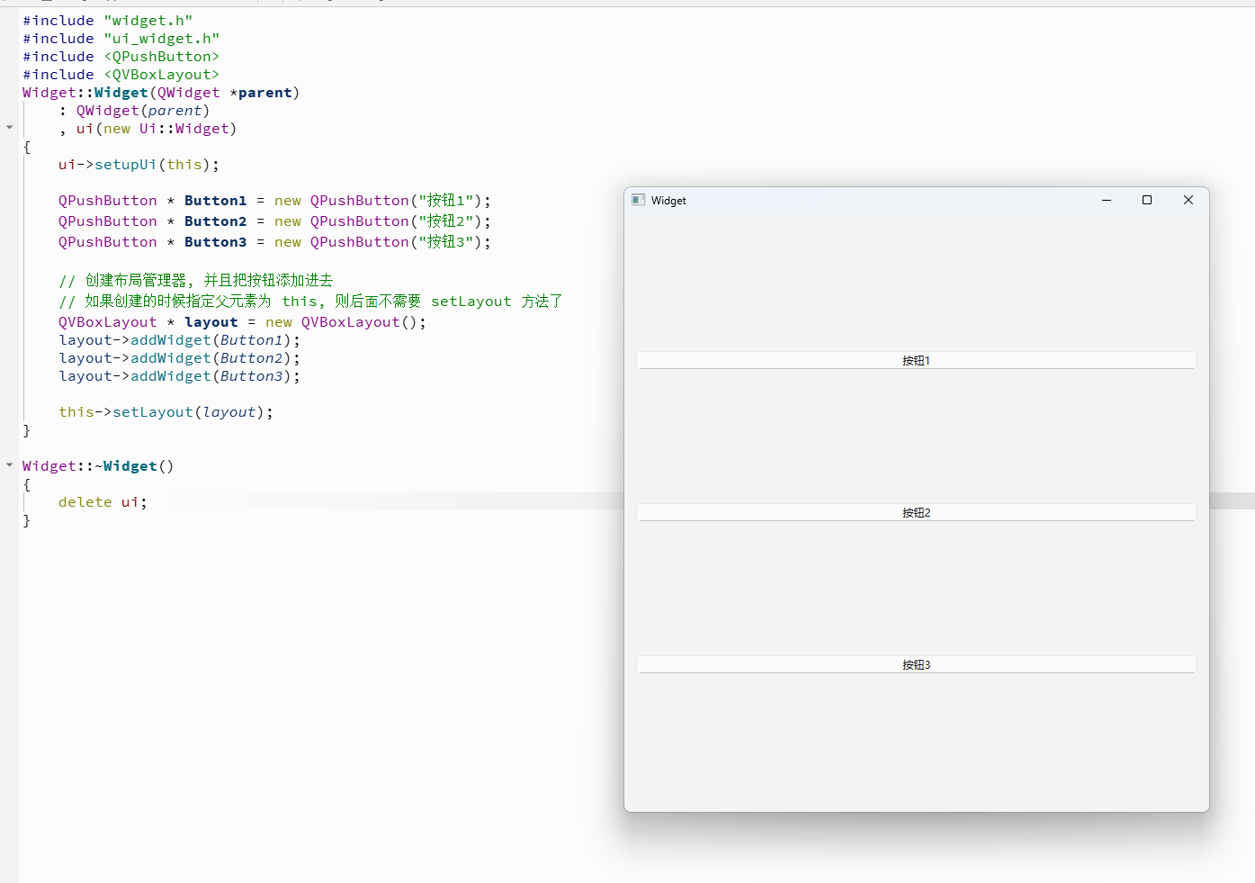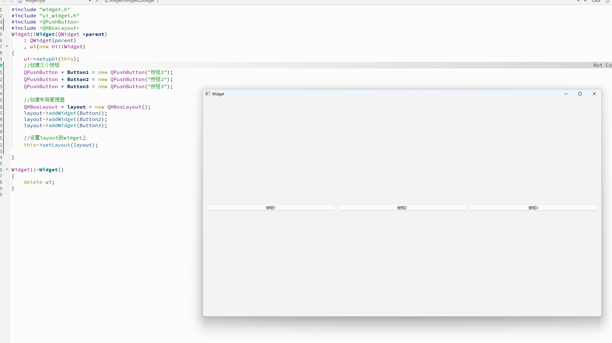 创建⼀组左右排列的按钮.在界⾯上创建⼀个 QVBoxLayout , 并添加两个按钮.