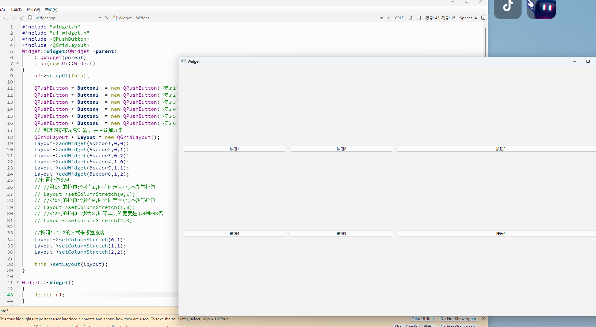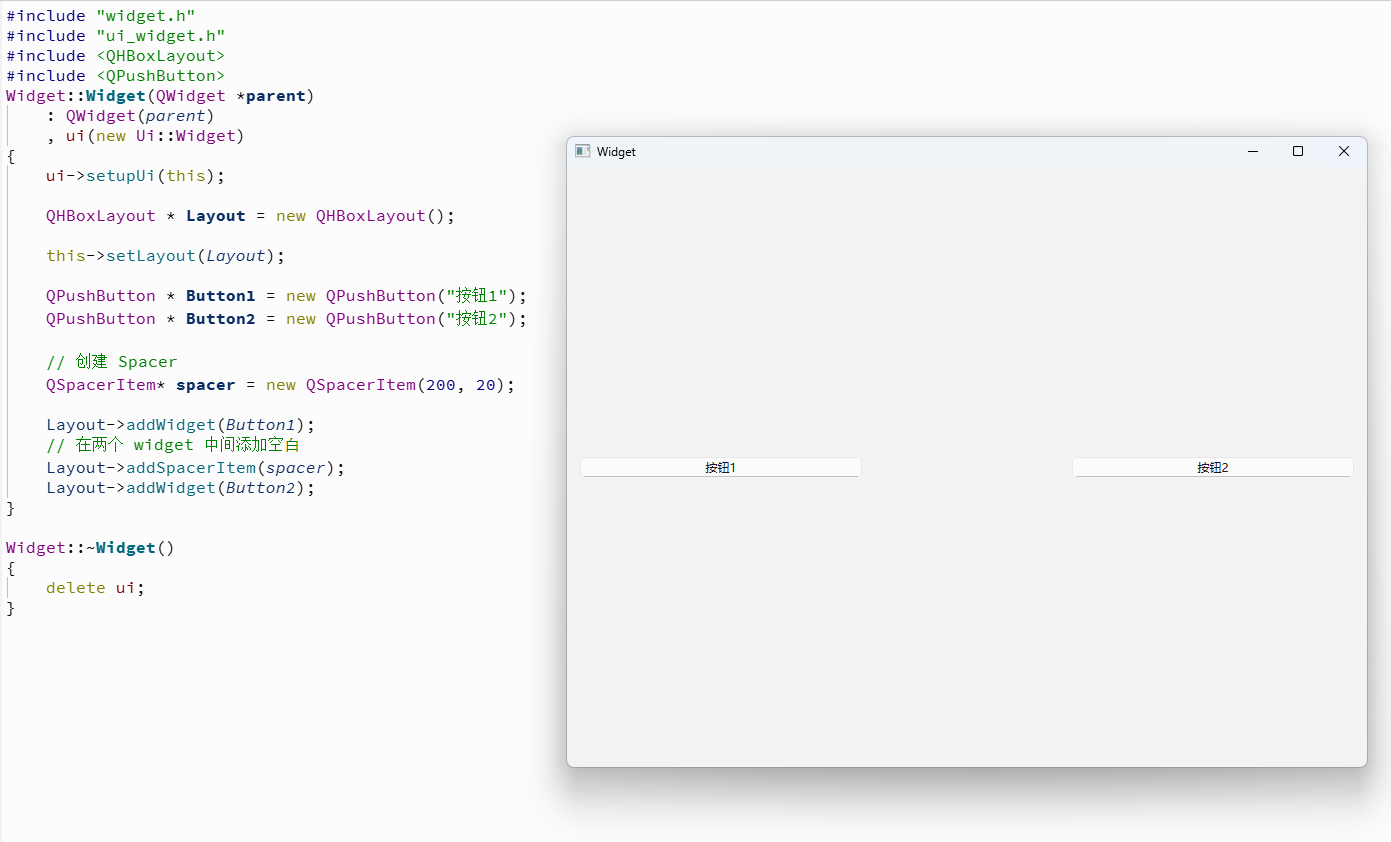 运行程序, 观察代码效果. 可以看到两个按钮之间已经存在了间隔了.调整 QSpacerItem 不同的尺寸, 即可看到不同的间距.
