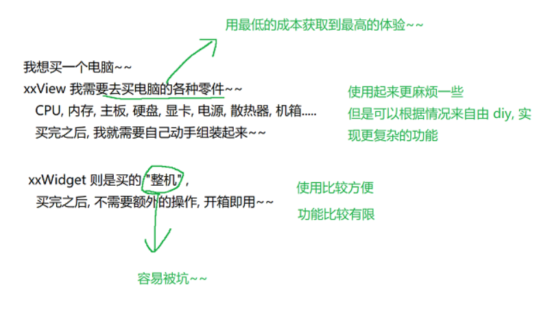- xxView是更底层的实现,xxWidget是基于xxView封装而来的.