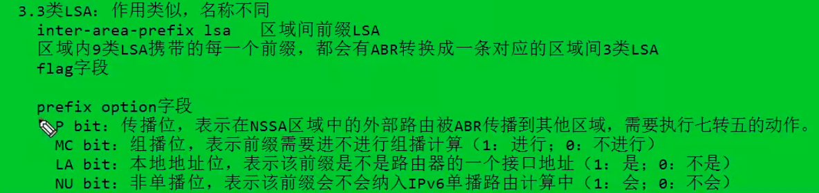 - LA(Link-Local Address,bit7):置 1 表示该前缀是链路本地地址(仅用于链路内通信,不被 Type9 LSA 引用)。