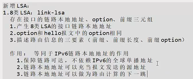 OSPFv3 新增的 Type8 LSA(Link LSA,链路 LSA),是仅在本地链路泛洪的专属 LSA,以下是结构化介绍: