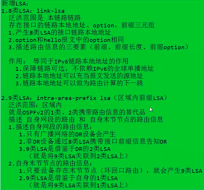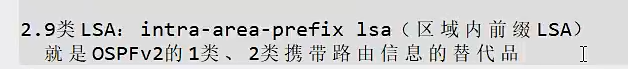 - 作用:它是 OSPFv3 中替代 OSPFv2 里 1 类(Router LSA)和 2 类(Network LSA)携带路由前缀信息的核心 LSA。