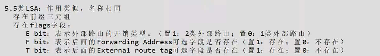 | F bit | 标识 Forwarding Address(转发地址)字段是否存在 | 1 = 存在(下一跳为该转发地址);0 = 不存在(下一跳为生成该 LSA 的 ASBR) |
