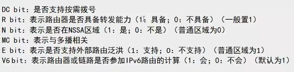 - R(1bit):标识始发路由器是否为有效 OSPFv3 路由器;