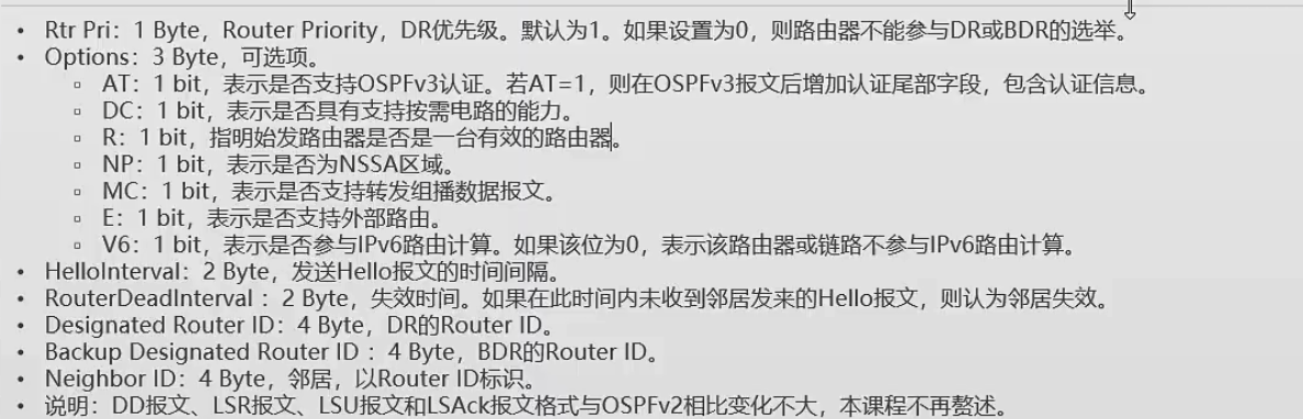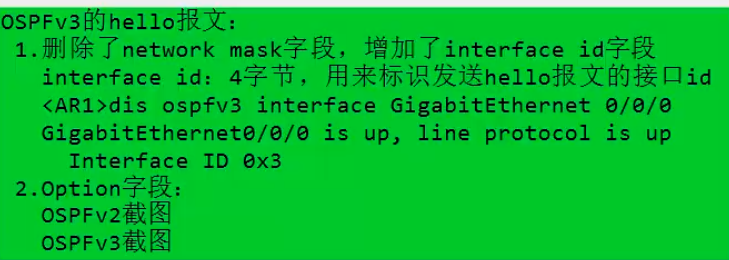 - 这些字段是 OSPFv3 邻居建立的核心协商参数,双方需在关键选项(如 NP、E、V6)上保持一致,否则无法建立邻居;