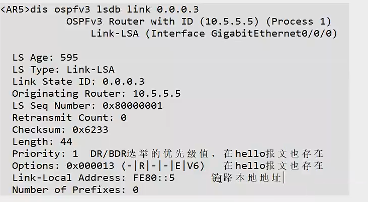 prefix option字段,标识前缀属性); - 接口的 DR 优先级、OSPFv3 选项(如 V6-bit、E-bit)。