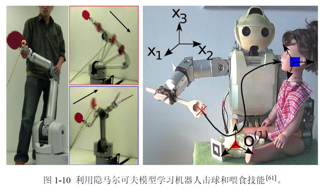 文献[62] 利用隐马尔可夫模型进行类人机器人的技能示教学习,实验表明该模型可以相对更好地表达不同状态之间的关联性。文献[61] 提出了HMM-GMR 技能表达框架,其中,利用HMM 对示教数据建模,而用GMR 模型生成最终的运动策略控制命令,并将该模型应用到了击打乒乓球和喂食任务(Food-feeding task) 中,如图1-10所示。