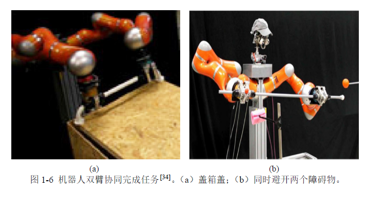 文献[34]则针对双臂协同技能学习,提出了一种新的DMP框架。该框架包含两个相互耦合的DMP模型,分别对应左臂和右臂的运动建模。通过在两套变换系统中引入一组互为反作用的虚拟力,使得一只机械臂的运动状态可被另一只实时感知,从而实现对双臂协同运动的自然耦合与协调控制。该文将该方法应用于机器人双臂协作任务中,具体如图1-6所示。