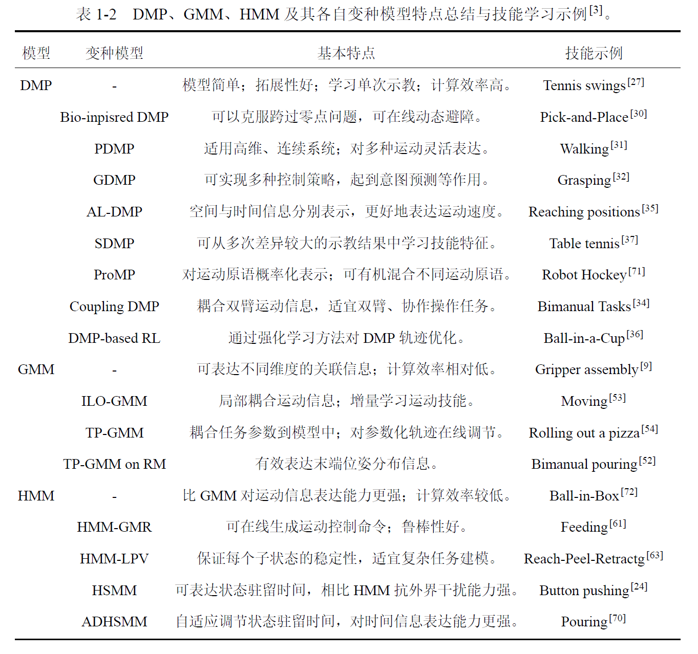 26\] Ijspeert A.J., Nakanishi J., Schaal S.. Trajectory formation for imitation with nonlinear dynamical systems \[C\]. Proceedings 2001 IEEE/RSJ International Conference on Intelligent Robots and Systems. Expanding the Societal Role of Robotics in the the Next Millennium (Cat. No. 01CH37180), 2001. 2:752--757 \[27\] Ijspeert A. J., Nakanishi J., Schaal S. Movement imitation with nonlinear dynamical systems in humanoid robots\[C\]. Proceedings of the IEEE International Conference on Robotics and Automation. Washington, DC, USA: IEEE, 2002: 1398-1403. \[28\] Ude A., Gams A., Asfour T., et al. Task-specific generalization of discrete and periodic dynamic movement primitives\[J\]. IEEE Transactions on Robotics, 2010, 26(5): 800-815. \[29\] Muelling K., Kober J., Peters J. Learning table tennis with a mixture of motor primitives\[C\]. 2010 10th IEEE-RAS International Conference on Humanoid Robots. Nashville, TN, USA: IEEE, 2010: 411-416. \[30\] Hoffmann H., Pastor P., Park D. H., et al. Biologically-inspired dynamical systems for movement generation: automatic real-time goal adaptation and obstacle avoidance\[C\]. 2009 IEEE International Conference on Robotics and Automation. Kobe, Japan: IEEE, 2009: 2587-2592. \[31\] Rückert E., d'Avella A. Learned parametrized dynamic movement primitives with shared synergies for controlling robotic and musculoskeletal systems\[J\]. Frontiers in Computational Neuroscience, 2013, 7: 138. \[32\] Krug R., Dimitrov D. Model predictive motion control based on generalized dynamical movement primitives\[J\]. Journal of Intelligent \& Robotic Systems, 2015, 77(1): 17-35. \[33\] Meier F., Schaal S. A probabilistic representation for dynamic movement primitives\[J\]. arXiv preprint arXiv:1612.05932, 2016. \[34\] Gams A., Nemec B., Ijspeert A. J., et al. Coupling movement primitives: Interaction with the environment and bimanual tasks\[J\]. IEEE Transactions on Robotics, 2014, 30(4): 816-830. \[35\] Gašpar T., Nemec B., Morimoto J., et al. Skill learning and action recognition by arc-length dynamic movement primitives\[J\]. Robotics and Autonomous Systems, 2018, 100: 225-235. \[36\] Kober J., Mohler B., Peters J. Learning perceptual coupling for motor primitives\[C\]. 2008 IEEE/RSJ International Conference on Intelligent Robots and Systems. Nice, France: IEEE, 2008: 834-839. \[37\] Stulp F., Theodorou E. A., Schaal S. Reinforcement learning with sequences of motion primitives for robust manipulation\[J\]. IEEE Transactions on Robotics, 2012, 28(6): 1360-1370. \[38\] Yin X., Chen Q. Learning nonlinear dynamical system for movement primitives\[C\]. 2014 IEEE International Conference on Systems, Man, and Cybernetics. San Diego, CA, USA: IEEE, 2014: 3761-3766. \[39\] Matsubara T., Hyon S. H., Morimoto J. Learning stylistic dynamic movement primitives from multiple demonstrations\[C\]. 2010 IEEE/RSJ International Conference on Intelligent Robots and Systems. Taipei, China: IEEE, 2010: 1277-1283. \[40\] Kober J., Peters J. R. Policy search for motor primitives in robotics\[C\]. Advances in Neural Information Processing Systems 22 (NIPS 2009). Vancouver, British Columbia, Canada: Curran Associates, Inc., 2009: 849-856. \[41\] Theodorou E., Buchli J., Schaal S. A generalized path integral control approach to reinforcement learning\[J\]. Journal of Machine Learning Research, 2010, 11(Nov): 3137-3181. \[42\] Buchli J., Stulp F., Theodorou E., et al. Learning variable impedance control\[J\]. The International Journal of Robotics Research, 2011, 30(7): 820-833. \[43\] Li Z., Zhao T., Chen F., et al. Reinforcement learning of manipulation and grasping using dynamical movement primitives for a humanoidlike mobile manipulator\[J\]. IEEE/ASME Transactions on Mechatronics, 2017, 23(1): 121-131. \[44\] Stulp F., Sigaud O. Robot skill learning: From reinforcement learning to evolution strategies\[J\]. Paladyn, Journal of Behavioral Robotics, 2013, 4(1): 49-61. \[45\] Hu Y., Wu X., Geng P., et al. Evolution strategies learning with variable impedance control for grasping under uncertainty\[J\]. IEEE Transactions on Industrial Electronics, 2018, 66(10): 7788-7799. \[46\] Calinon S., Lee D. Learning control\[M\]// Humanoid Robotics: a Reference. Berlin, Germany: Springer, 2016: 1-52. \[47\] Calinon S., Bruno D. A programming by demonstration model combining statistics, dynamical systems and optimal control\[R\]. Martigny, Switzerland: Idiap Research Institute, 2014. \[48\] Calinon S., Guenter F., Billard A. On learning, representing, and generalizing a task in a humanoid robot\[J\]. IEEE Transactions on Systems, Man, and Cybernetics, Part B (Cybernetics), 2007, 37(2): 286-298. \[49\] Muhlig M., Gienger M., Hellbach S., et al. Task-level imitation learning using variance-based movement optimization\[C\]. 2009 IEEE International Conference on Robotics and Automation. Kobe, Japan: IEEE, 2009: 1177-1184. \[50\] Gribovskaya E., Khansari-Zadeh S. M., Billard A. Learning non-linear multivariate dynamics of motion in robotic manipulators\[J\]. The International Journal of Robotics Research, 2011, 30(1): 80-117. \[51\] Khansari-Zadeh S. M., Billard A. Learning stable nonlinear dynamical systems with Gaussian mixture models\[J\]. IEEE Transactions on Robotics, 2011, 27(5): 943-957. \[52\] Zeestraten M. J., Havoutis I., Silvério J., et al. An approach for imitation learning on Riemannian manifolds\[J\]. IEEE Robotics and Automation Letters, 2017, 2(3): 1240-1247.