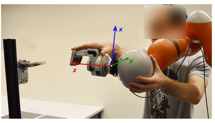 (3)基于物理交互的示教方式: 在这种示教方式下,示教者与机器人直接物理接触在机器人的示教模式下牵引机器人完成某项任务。如图1-4(b) 所示,示教者直接牵引KUKA 机器人的末端打开一个门把手。这种示教方式主要针对的是新型的协作机器人,一方面原因是这类机器人会向用户提供示教模式以方便对其完成示教;另一方面原因是这类机器人为人与机器人共同协作而设计,因而可以相对保证人机交互的安全性。在这种示教方式下人与机器人有直接的力的交互,因而可以增强人机交互的浸入感。其缺点是示教者与机器人近距离接触,导致人的运动受到一定限制。