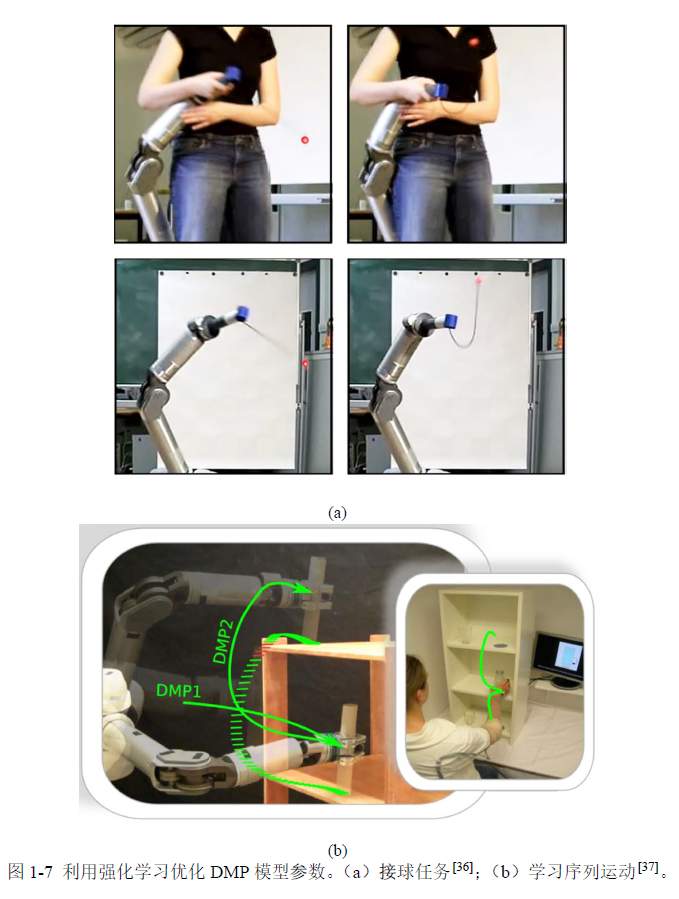 如前文所述,可以利用强化学习算法对DMP 模型进行优化以满足任务要求。一般流程是:首先人对机器人示教得到示教数据;根据示教数据学习DMP 模型;在技能复现阶段,把学习到的DMP 参数作为强化学习算法的初始策略,根据任务要求定义适合的代价函数对DMP 模型参数进行优化直到完成任务。其中,有几种比较典型的基于DMP 模型的强化学习算法。文献[36,40] 提出了一种带回报权重搜索策略学习算法(Policylearning by weighting exploration with the returns,PoWER),用于DMP 模型的参数调节与优化;并将感知单元作为外部环境变量耦合到DMP 模型各个自由度的变换系统中。在任务复现阶段,PoWER 算法同时对表示环境的参数进行优化,可降低试错的次数。该算法在机器人接球实验中得到了验证,如图1-7(a) 所示。