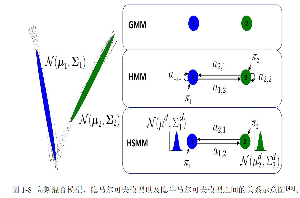 (半)隐马尔可夫模型与高斯混合模型在技能表达上具有一定相似性,区别在于模型中各状态之间是否有联系。高斯混合模型、隐马尔可夫模型以及半隐马尔可夫模型之间的关系示意图如图1-8所示。以两个状态为例,在高斯混合模型中两个状态相互独立,两个状态之间没有任何关联信息;在隐马尔可夫模型中,一个状态可以向另外一个状态以一定的概率发生状态转移;在半隐马尔可夫模型中,不但可以状态转移,每个状态还以高斯分布的形式有持续时间,因而可以在技能表达中包含更丰富的时间信息。