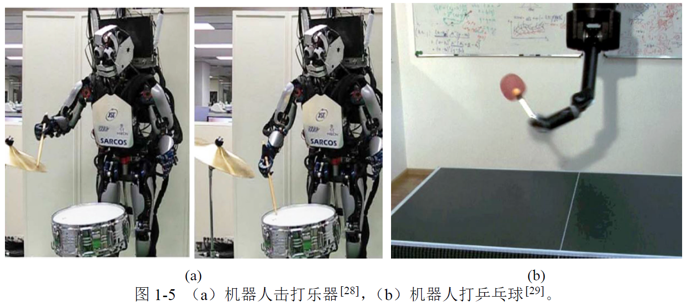 文献[28]结合DMP模型提出了"查询子"的概念。该方法不仅考虑从示教数据中学习到的运动控制策略(即原DMP模型参数),还考虑了机器人在任务复现过程中的实时任务参数。通过引入查询子,能够将已学习好的DMP模型与当前任务状态动态关联。当任务状态发生变化时,可便捷地对模型参数进行选择或调整,从而实现技能的有效泛化。作者将该方法应用于机器人击打乐器任务,如图1-5(a)所示。
