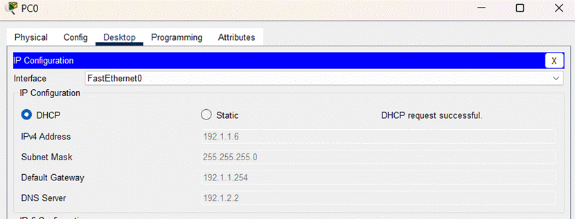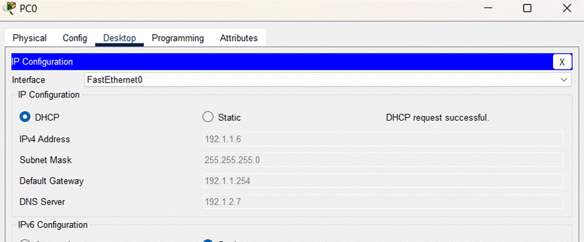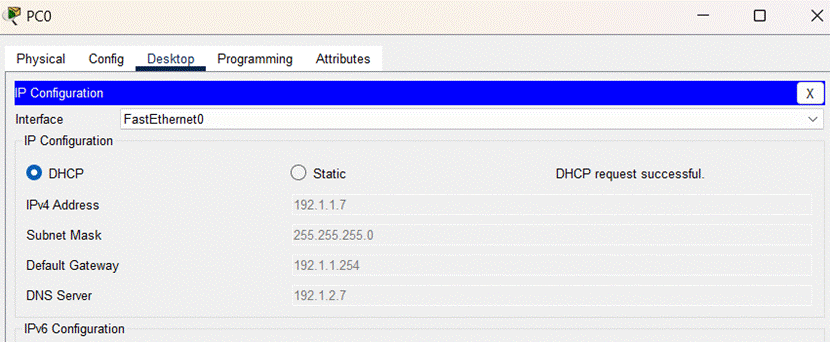 (5)启动PC0通过DHCP自动获取网络信息的过程,结果如图所示: