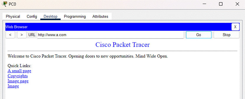 启动PC0的浏览器,在地址栏中输入完全合格的域名,PC0访问的Web服务器的主页如图所示: