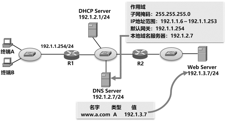 终端通过DHCP自动获取的网络信息中包含本地域名服务器地址,对于如图4.1所示的网络应用系统,DHCP服务器中给出的本地域名服务器地址是192.1.2.7。地址为192.1.2.7的域名服务器中与完全合格的域名www.a.com绑定的Web服务器的IP地址是192.1.3.7。因此,终端可以用完全合格的域名www.a.com访问到Web服务器。