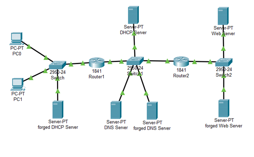 (6)在之前的拓扑图上添加伪造的DHCP服务器、伪造的DNS服务器以及伪造的Web服务器。添加后的拓扑图如图所示: