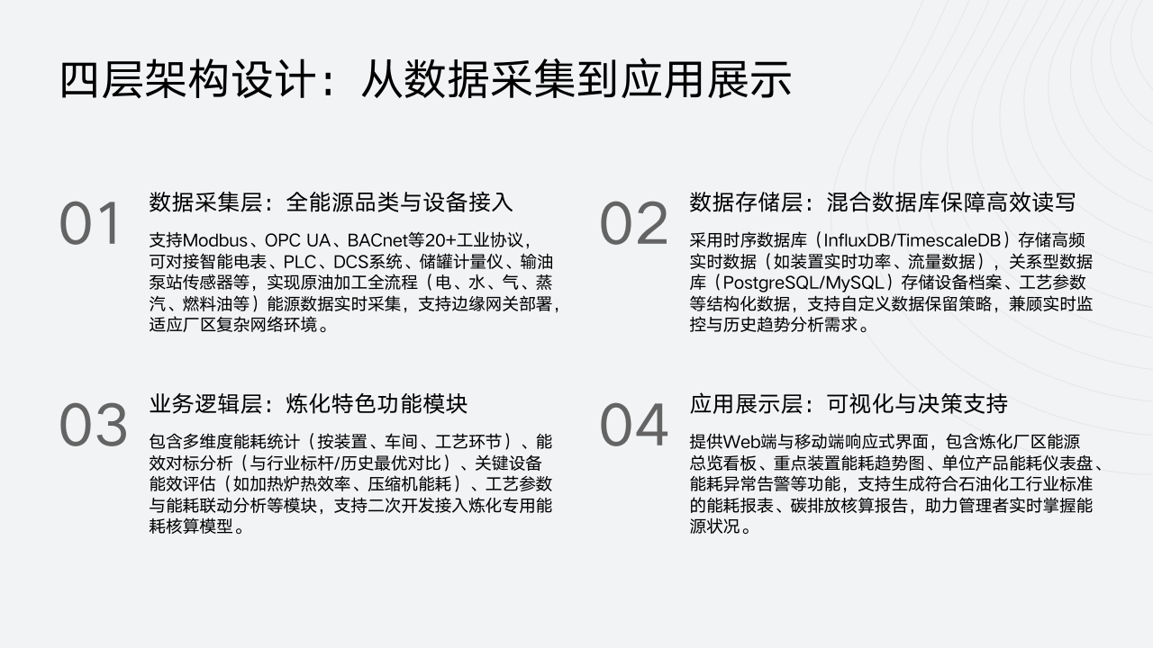 MyEMS系统采用四层架构设计,从数据采集到应用展示,各层紧密协作,为原油加工及石油制品制造行业提供了全面且高效的能源管理解决方案。