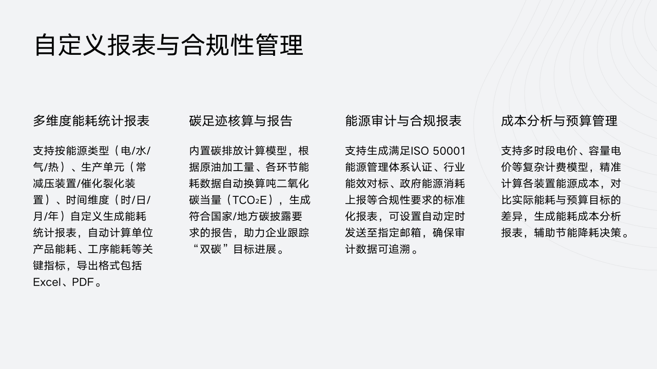 再者是炼化特色报表与合规输出。开发符合石油炼制行业规范的能耗报表模板,支持自动统计原油加工损失率、综合能耗、单位产品能耗等关键指标,并可按要求格式导出,用于政府监管上报或ISO 50001能源管理体系认证,满足企业合规需求。
