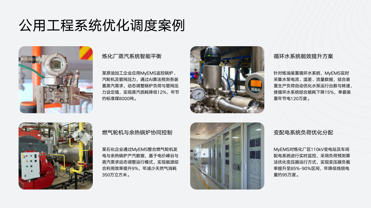 此外,MyEMS对炼化厂区110kV变电站及车间配电系统进行实时监控,采用负荷预测算法优化变压器运行方式,将变压器负载率提升至85%-90%区间,年降低线损电量约95万度,优化了变配电系统的负荷分配。这些案例充分证明了MyEMS在公用工程系统优化调度方面的有效性和实用性。