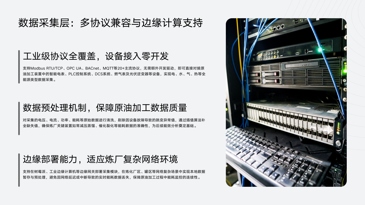 数据采集层实现了全能源品类与设备接入。该层支持20多种工业协议,可与智能电表、PLC、DCS系统等多种设备对接,能实时采集原油加工全流程的能源数据。同时,支持边缘网关部署,可适应厂区复杂的网络环境,确保数据采集的稳定性和可靠性。