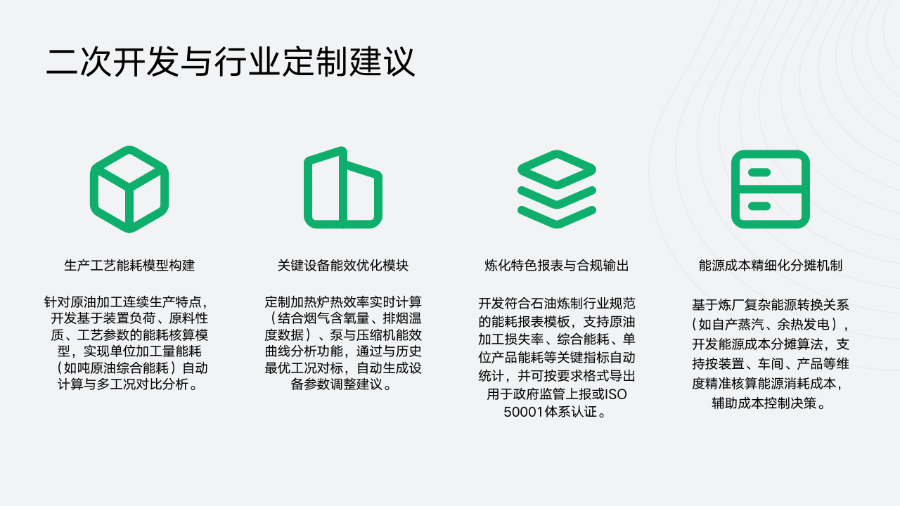 为满足原油加工及石油制品制造企业的多样化需求,MyEMS提供了一系列二次开发与行业定制建议。