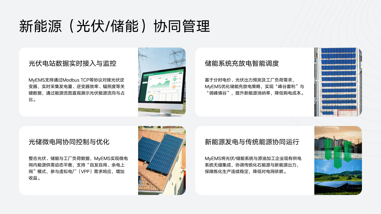 在原油加工企业能源管理中,新能源(光伏/储能)协同管理是重要的一环,MyEMS在这方面发挥着关键作用。