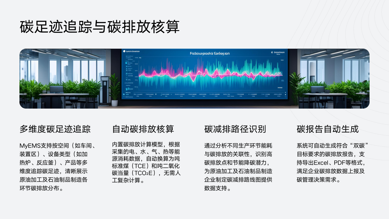 在"双碳"目标的大背景下,MyEMS系统内置碳排放计算模型,能根据能耗数据自动换算吨标准煤和吨二氧化碳当量,生成符合行业标准的碳足迹报告。这为原油加工企业提供了有效的碳排放管理工具,助力企业达成"双碳"目标。